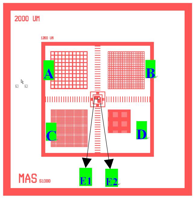 S1000扫描电镜放大倍率和测长标样是采用微电子技术加工的微纳米光栅模板产品外形为6x6mm的单晶硅片,厚度0.6mm,表面有多种微米、纳米的双向金线条,其图形见右图所示,共有八个不同尺度主要光栅区。是目前国内外唯一一个最适宜扫描电镜放